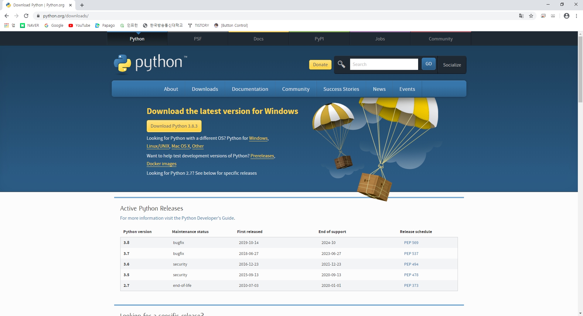 Download Python 3.8.3 을 눌러서 설치해주세요.