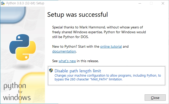 설치가 완료 됐다면 Close를 눌러주세요.